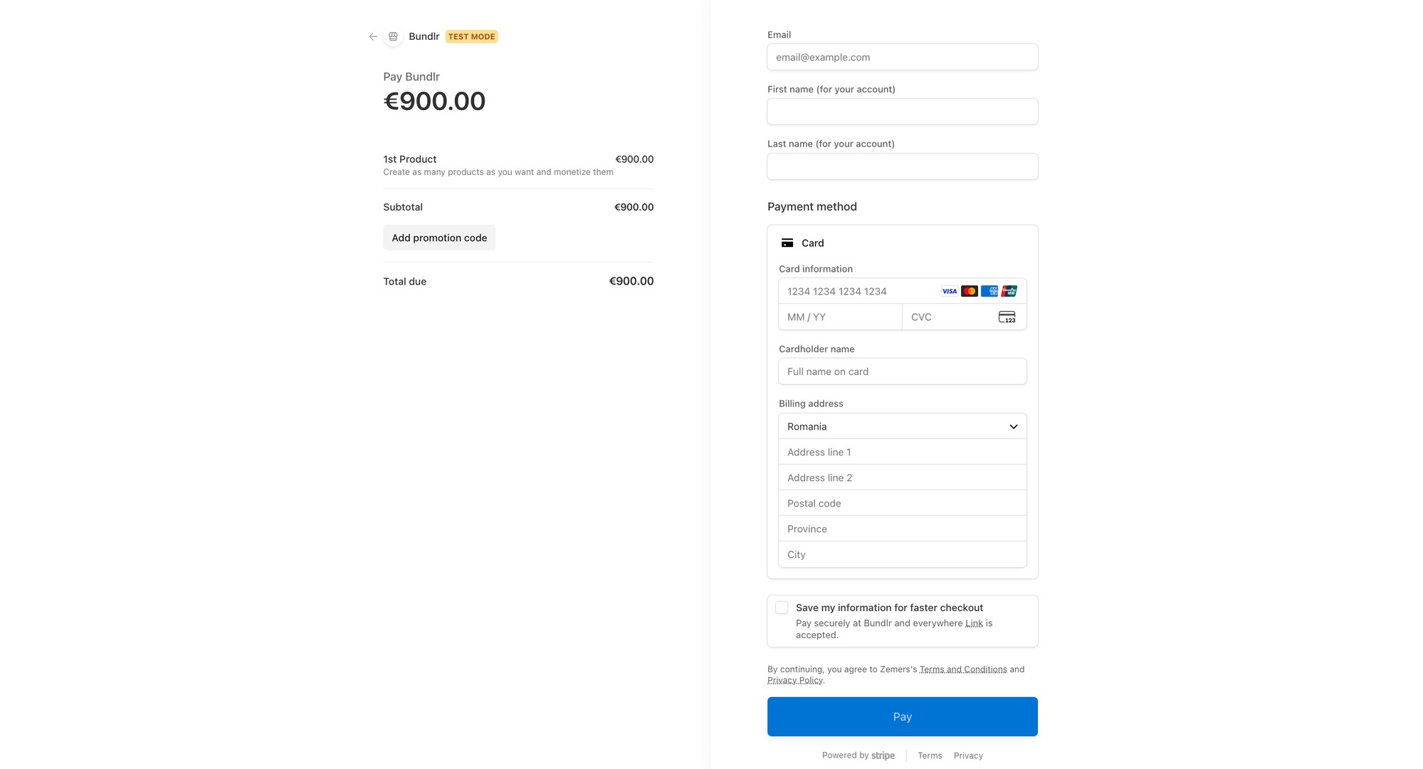 Regardless of the selected pricing option (free/subscription/etc.), your customer is redirected to a secure Stripe checkout page, where they enter their details and complete the online payment.