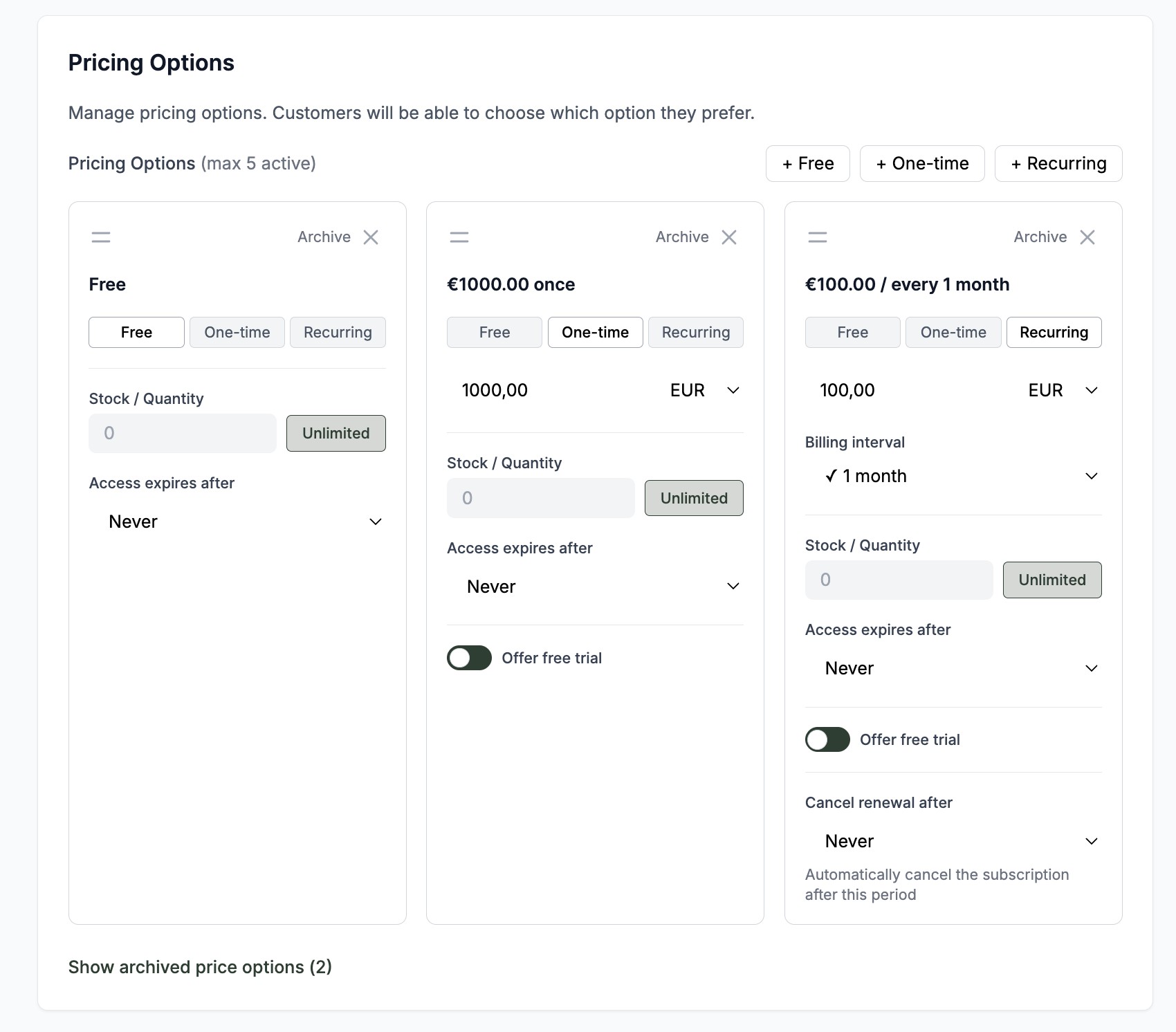For each pricing option, you can choose between: